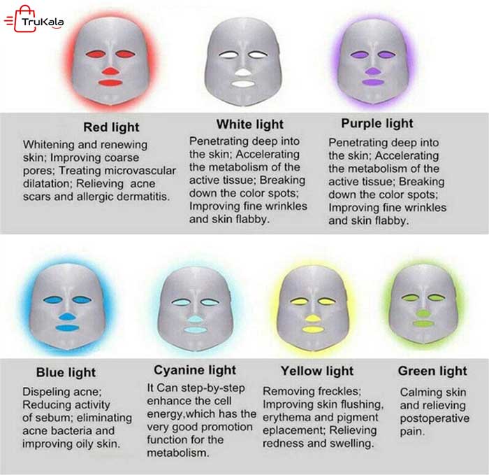 ماسک گلد گردن دار و صورت ال ای دی نور درمانی با رنگ های قرمز، آبی، سبز، زرد، بنفش، فیروزه ای و سفید می تواند به طور موثری بافت های پوست را تقویت و محکم کند و از ایجاد چین و چروک بر روی پوست، جلوگیری کند و همزمان چربی پوست را تنظیم و کنترل کند.