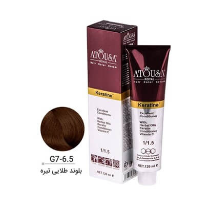 رنگ موی آتوسا رویال بلوند طلایی تیره حاوی کراتین و روغن های کیاهی و نرم کننده و ویتامین C می باشد.