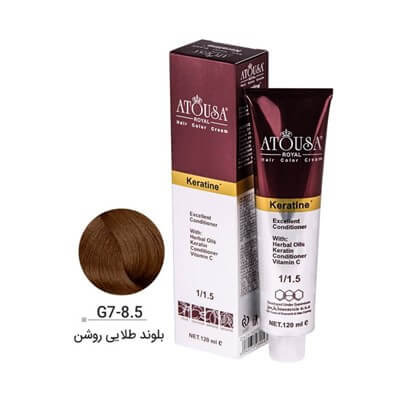 رنگ موی آتوسا رویال بلوند طلایی روشن حاوی کراتین و روغن های کیاهی و نرم کننده و ویتامین C می باشد.