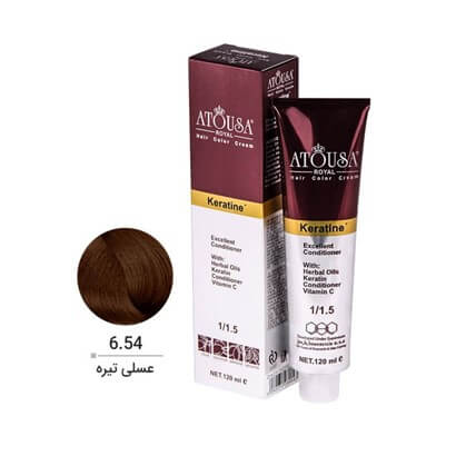 رنگ موی آتوسا رویال عسلی تیره حاوی کراتین و روغن های کیاهی و نرم کننده و ویتامین C می باشد.