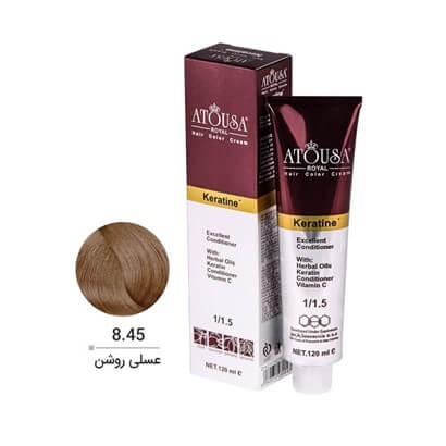 رنگ موی آتوسا رویال عسلی روشن حاوی کراتین و روغن های کیاهی و نرم کننده و ویتامین C می باشد.
