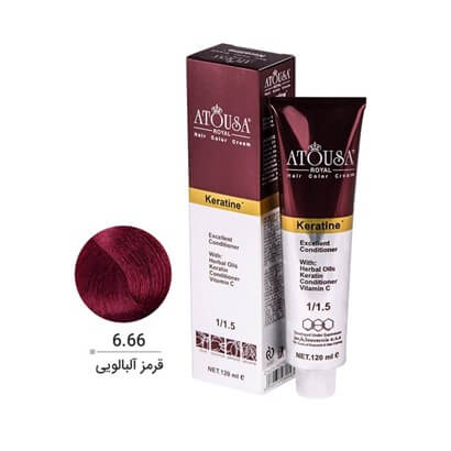 رنگ موی آتوسا رویال قرمز آلبالویی حاوی کراتین و روغن های کیاهی و نرم کننده و ویتامین C می باشد.