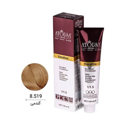 رنگ موی آتوسا رویال گندمی حاوی کراتین و روغن های کیاهی و نرم کننده و ویتامین C می باشد.