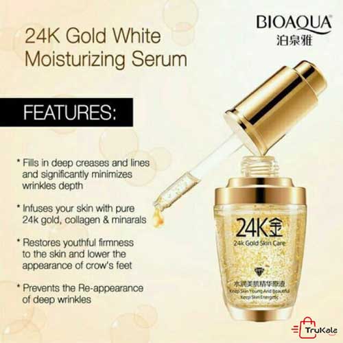 سرم طلای 24 عیار صورت، باعث استحکام و صافی پوست صورت می شود. استفاده از سرم صورت طلا بیواکوا، براق کنندگی، روشن کنندگی و جوانسازی را به پوست شما هدیه می کند همچنین موادی که به پوست شما نفوذ می کند باعث پاکسازی بیشتر پوست می شود و پوست صورت شما را روشن تر و سفید تر می کند.