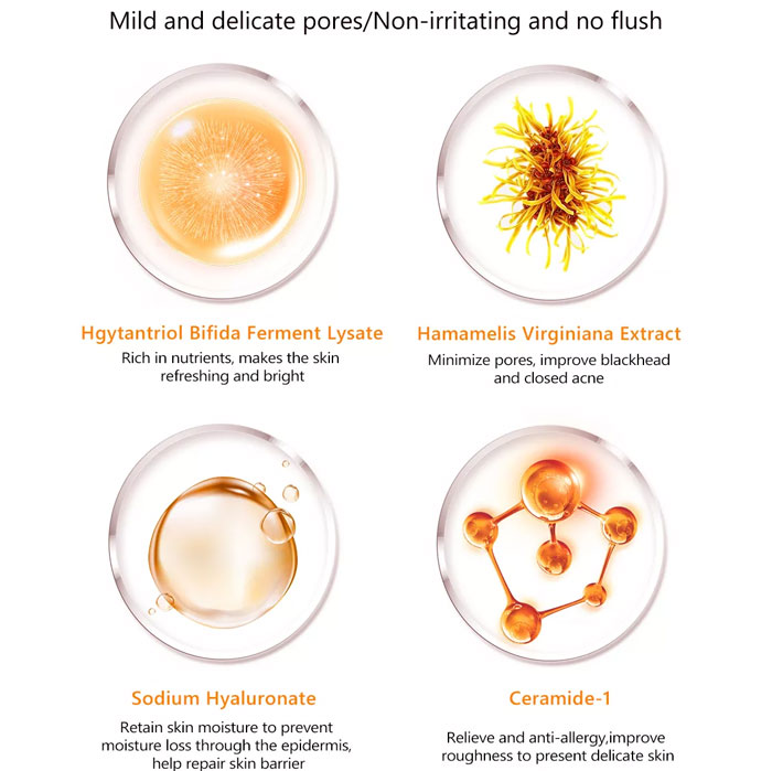 اب، عصاره Hamamelis Virginiana. Hgytantriol Bifida Ferment Lysate. گلیسیرین، آلفا هیدروکسیل اسید. بوتاندیول، عصاره Hypericum Perforatum. عصاره ریشه Boerhavia Diffusa. اسید سالیسیلیک. B-گلوکان، سرامید-1. عصاره میوه Avena Sativa، 1،2-هگزان دیول، P-Hydroxyacetophenone. متیل پارابن، هیالورونات سدیم. EDTA- نمک دی سدیم