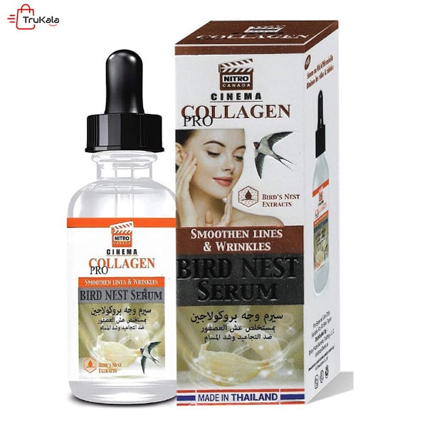 سرم کلاژن آشیانه پرنده سینما دارای حجم 30 میلی لیتر و ساخت کشور تایلند میباشد. این سرم حاوی مقادیر زیادی کلاژن، هیالورونیک اسید، ویتامین B و نیاسین آمید است. حضور کلاژن و هیالورونیک اسید برای بافت پوست بسیار مفید است و باعث استحکام پوست می شوند. و بافت پوست را شاداب و جوان نگه می دارد. سرم کلاژن پرنده سینما محصولی غلیظ و غنی از مولکول های کوچک تغذیه کننده ی پوست می باشد. به همین علت است که توانایی نفوذ به اعماق پوست را دارد. علاوه بر این سرم کلاژن دارای ویتامین C و کلاژن پیچیده ای است که باعث صاف شدن پوست می شود. و پوست را مرطوب می کند و چین و چروک را از بین می برد و از ایجاد چین و چروک جدید در پوست جلو گیری می کند.