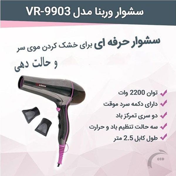 سشوار وربنا مدل VR-9903 یکی از مدل های سشوار برند وربنا که با توان 2200 وات و موتور AC مناسب برای سالن های آرایشگاهی است. این سشوار با سرعت باد بسیار زیاد قابل استفاده برای براشینگ است. برای حالت دادن و خشک کردن موها با استفاده از دکمه های روی دسته، سرعت و حرارت باد را می توان تنظیم نمود. از دیگر ویژگی های این سشوار میتوان به دو سری متمرکز کننده هوا و دیسپانسر اشاره کرد.