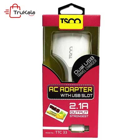 شارژر دیواری تسکو مدل TTC 33 محصول شرکت TSCO می باشد. با استفاده از این کلگی شارژر می توانید همزمان دو دستگاه را شارژ کنید. این محصول دو خروجی USB با مجموع جریان خروجی ۲٫۱ آمپر دارد. با استفاده از این دو درگاه میتوانید گوشی موبایل و یا تبلت خود را شارژ کنید. ولتاژ ورودی در این شارژر ۱۰۰ تا ۲۴۰ ولت و ولتاژ خروجی در آن ۵ ولت است. بدنه این شارژر دیواری از جنس پلاستیک سخت مقاوم در برابر خط و خش است. این محصول با اتصال به برق شهری جریان لازم را برای شارژ گوشیهای موبایل و یا تبلت فراهم میکند.