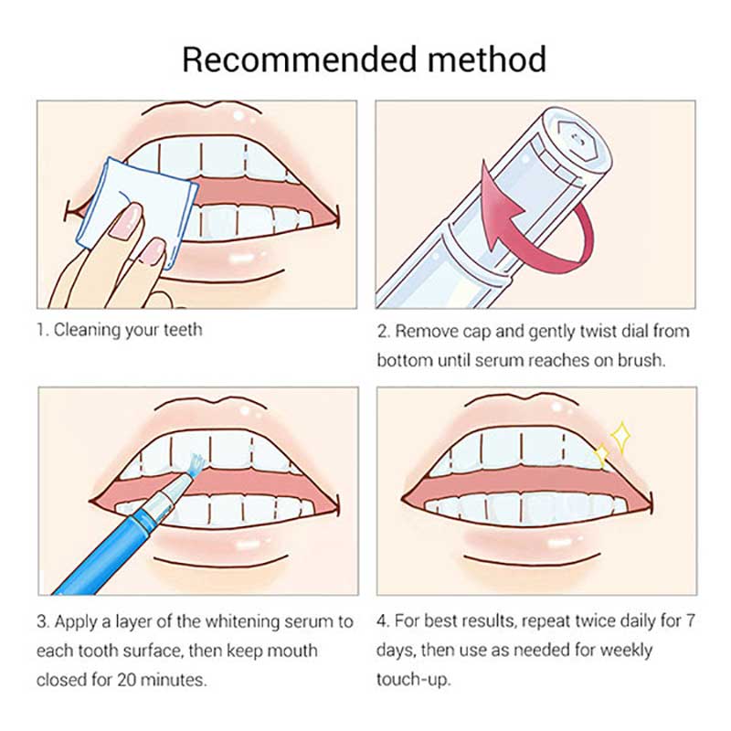 دندان های خود را بشوید، قبل از مصرف دندان ها را خشک کرده و سپس قلم را فشار دهید و روی سطوح دندان بزنید. به مدت 20 دقیقه دهان خود را بسته نگه دارید. ابتدا جهت تاثیرگذاری هر روز 2 بار به مدت یک هفته مصرف کنید و بعد از آن در جهت لزوم مصرف را به صورت هفتگی ادامه دهید.