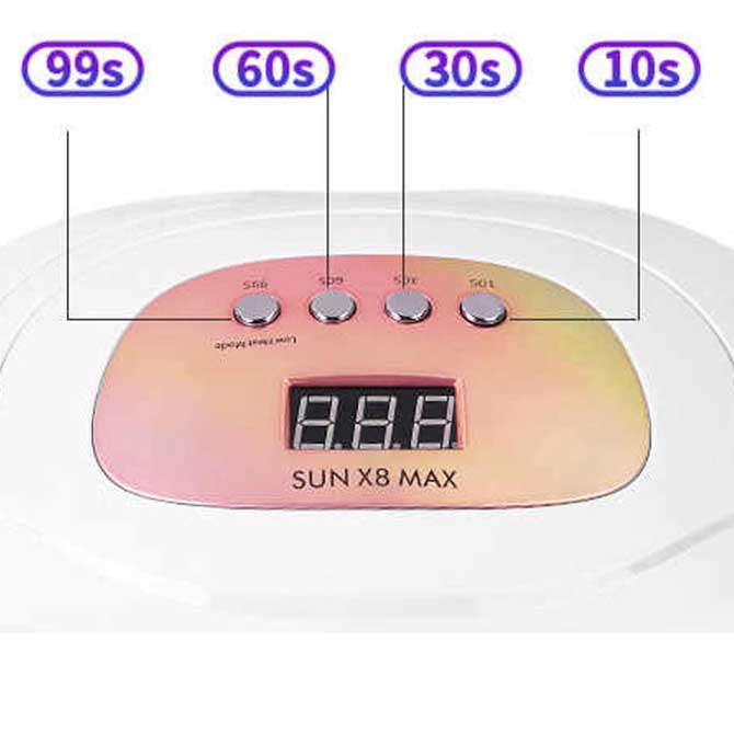 بر روی دستگاه UV-LED SUN X8 MAX یک صفحه نمایش و 4 دکمه مشاهده میشود. دکمه های تایمر 10/30/60 ثانیه که بعد از فشردن هر کدام از این دکمه ها لامپ های دستگاه به مدت مشخص و با قدرت کامل روشن میشوند، با فشردن دکمه 99 ثانیه ( LOW HEAT MODE ) لامپ های دستگاه به مدت 99 ثانیه ولی با شدت نور کمتر روشن میشوند.