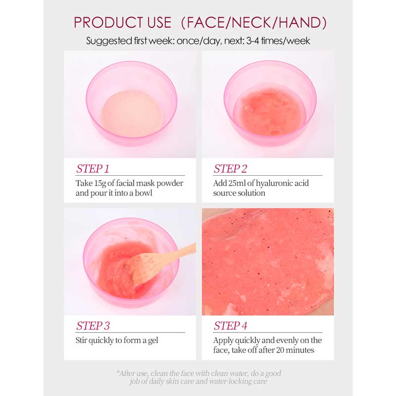 ابتدا 15 گرم پودر ماسک صورت را بردارید و آن را در یک کاسه بریزید. سپس 25 میلی لیتر محلول منبع اسید هیالورونیک را اضافه کنید. ماسک به دست آمده را یکنواخت روی صورت بمالید. و در آخر پس از 20 دقیقه بردارید.