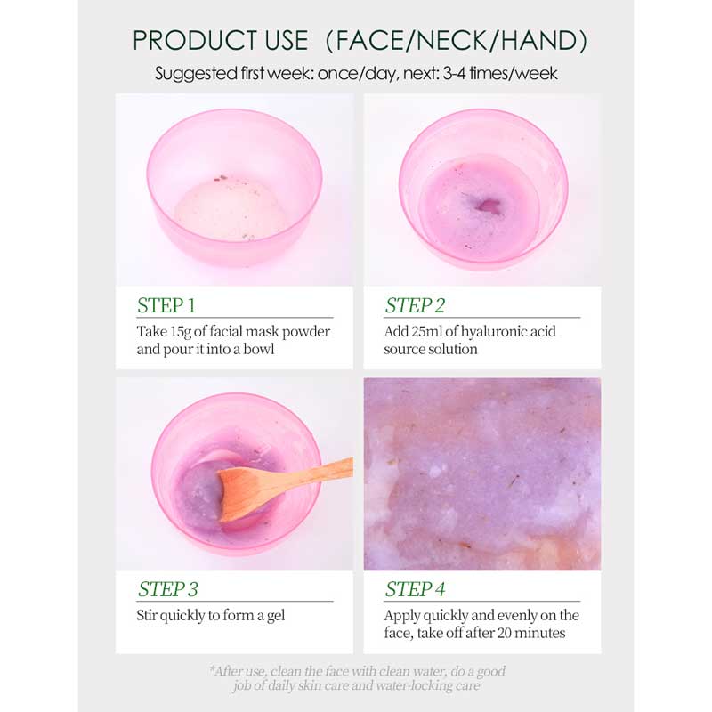 ابتدا 15 گرم پودر ماسک صورت را بردارید و آن را در یک کاسه بریزید. سپس 25 میلی لیتر محلول منبع اسید هیالورونیک اضافه کنید. و سریع محلول را هم زده تا به شکل ژل درآید. و در آخر سریع و یکنواخت روی صورت بمالید، پس از 20 دقیقه بردارید.