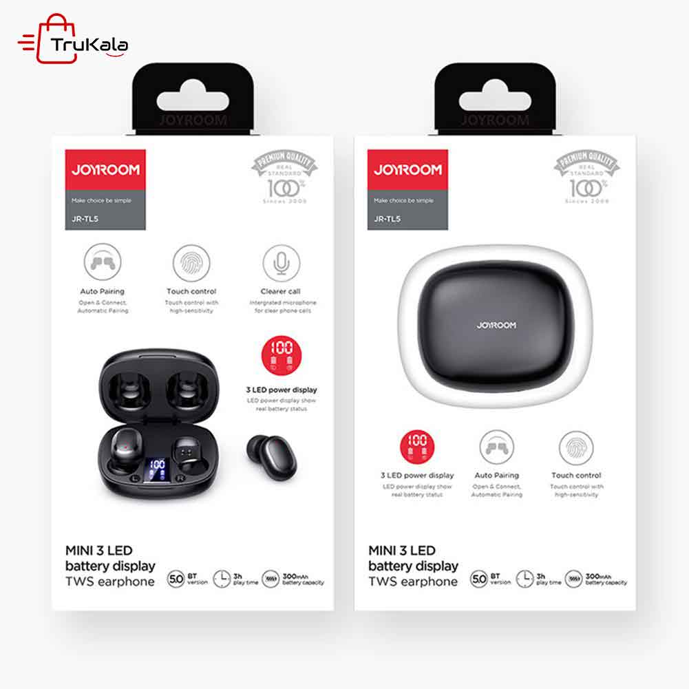 هندزفری بی سیم بلوتوثی جوی روم مدل JR-TL5 طراحی شده و تولید شده توسط شرکت JOYROOM یکی از بهترین هندزفری هایی است که با قیمت مناسب در بازار وجود دارد. امروزه هندزفری های بی سیم محبوبیت زیادی در بین دوستداران موسیقی به دست آورده اند، که تمایل دارند با آهنگ های مورد علاقه خود را در حال حرکت گوش دهند. از ویژگی منحصر به فرد این هندزفری ها حمل راحت و استفاده ی آن ها است. به طوریکه از این به بعد شما نگران پاره شدن یا گره خوردن سیم هندزفری خود نمی باشید و هنگام حرکت و استفاده از این هندزفری ها، سیم هندزفری مزاحم شما نمی شود. این هندزفری با صفحه نمایش LED سه قسمتی و هوشمند خود می تواند در هر لحظه وضعیت شارژ هندزفری ها و جعبه را به شما نشان می دهد.