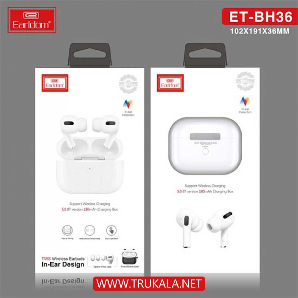 هندزفری بی سیم بلوتوثی Earldom مدل ET-BH36 طراحی شده و تولید شده توسط شرکت Earldom یکی از بهترین هندزفری هایی است که با قیمت مناسب در بازار وجود دارد. امروزه هندزفری های بی سیم محبوبیت زیادی در بین دوستداران موسیقی به دست آورده اند، که تمایل دارند با آهنگ های مورد علاقه خود را در حال حرکت گوش دهند. از ویژگی منحصر به فرد این هندزفری ها حمل راحت و استفاده ی آن ها است. به طوریکه از این به بعد شما نگران پاره شدن یا گره خوردن سیم هندزفری خود نمی باشید و هنگام حرکت و استفاده از این هندزفری ها، سیم هندزفری مزاحم شما نمی شود. این هندزفری مشابه هندزفری های ایر پاد بوده و دقیقا مشابه آنها به گوشی آیفون متصل می شوند. همچنین با کنترل لمسی می توان به تماس های خود پاسخ داد یا موسیقی را پخش یا متوقف کرد.