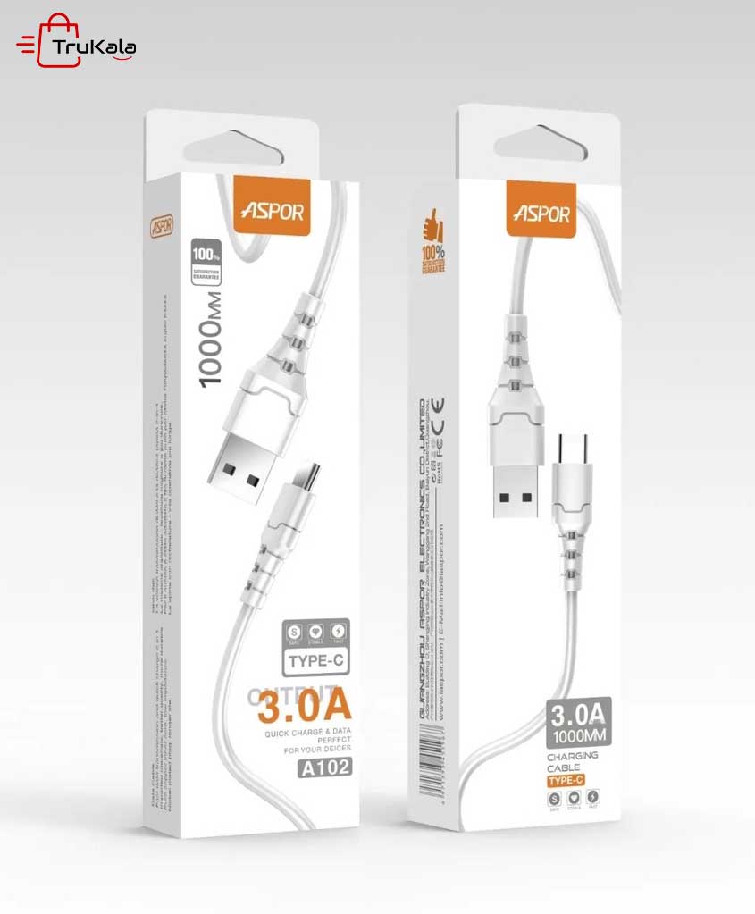 کابل شارژر آسپور تایپ سی مدل A102 محصولی از شرکت Aspor است. که یکی از شرکت های نوپا در زمینه ی تولید لوازم جانبی گوشی می باشد. این کابل هم برای شارژ و هم برای انتقال داده نیز است. این کابل دارای طول 1 متر است که دارای جنس با کیفیت سیم و بدنه است. این نوع از جنس سیم ماندگاری آن را بیشتر می کند. این کابل برای شارژ دستگاه های دارای درگاه type C طراحی شده است. کابل شارژر آسپور مدل A102 با توان خروجی حداکثر 3 آمپری و ورودی 5 ولتی می تواند دستگاه شما را بدون هیچ مشکلی شارژ کند و در انتقال داده سرعت زیادی داشته باشد.