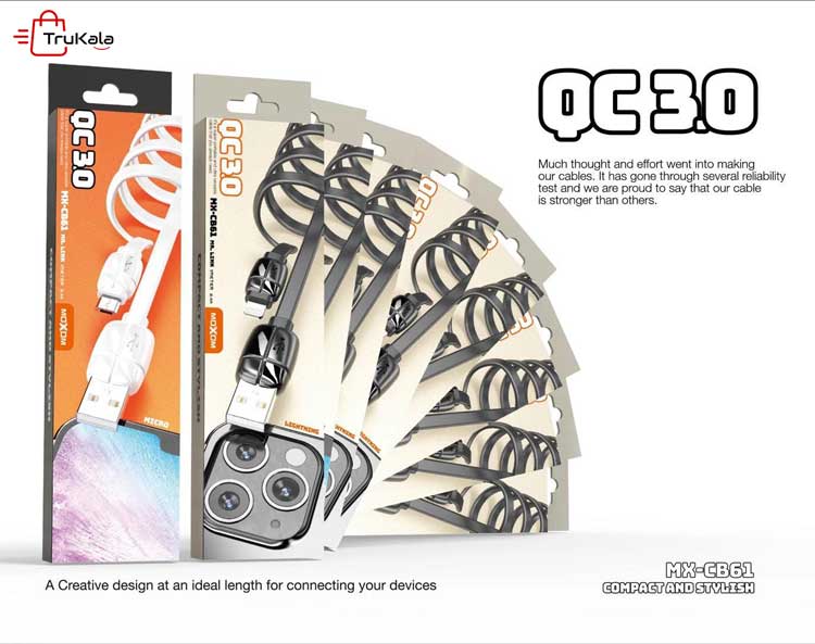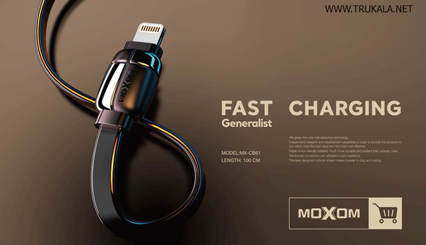 کابل شارژر موکسوم آیفون مدل MX-CB61 محصولی از شرکت MOXOM است. که یکی از با کیفیت ترین شرکت ها در زمینه ی تولید لوازم جانبی گوشی می باشد. این کابل شارژ مناسب فست شارژ می باشد. این کابل دارای طول 1 متر است. کابل شارژر موکسوم برای شارژ دستگاه های دارای درگاه لایتنینگ (Lightning) طراحی شده است. این کابل در دو رنگ سیاه و سفید تولید شده است. این کابل از فناوری Qualcomm پشتیبانی می کند که باعث می شود فست شارژ مناسب گوشی یا دستگاه شما تنظیم شود و باتری شما آسیبی وارد نشود.