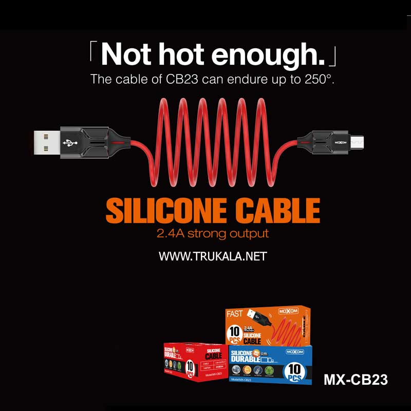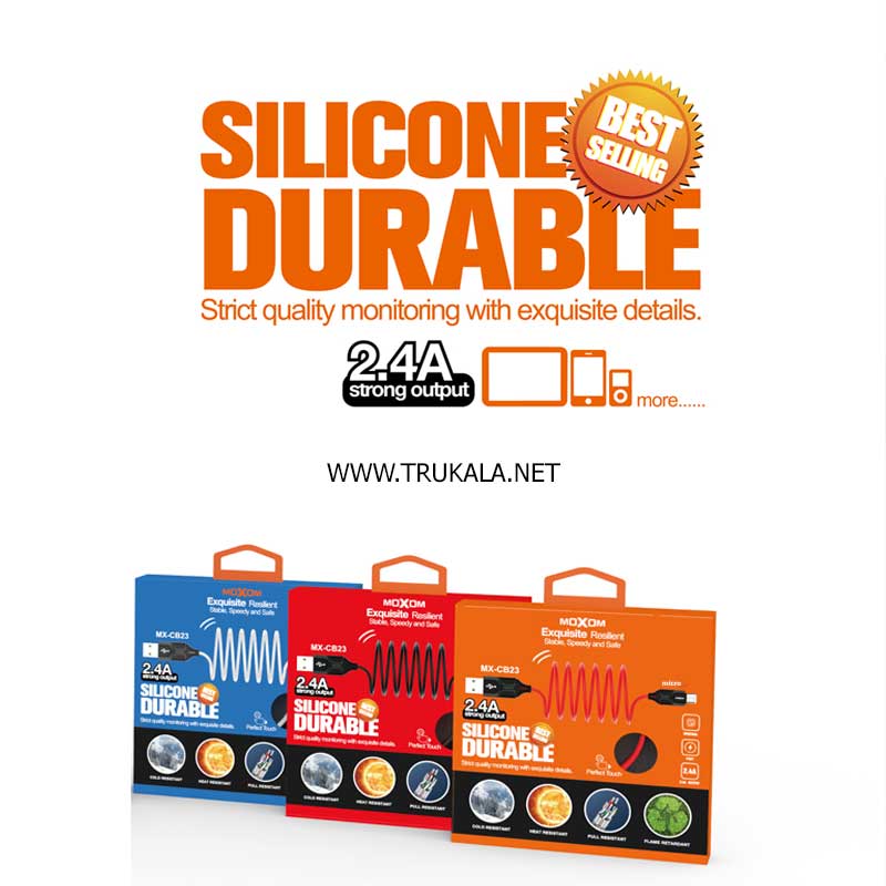 کابل شارژر موکسوم میکرو مدل MX-CB23 محصولی از شرکت MOXOM است. که یکی از با کیفیت ترین شرکت ها در زمینه ی تولید لوازم جانبی گوشی می باشد. این کابل شارژ مناسب فست شارژ می باشد. این کابل دارای طول 1 متر است و همچنین برای شارژ دستگاه های دارای درگاه میکرو (microUSB) طراحی شده است. این کابل ساخته شده از مواد سیلیکونی سازگار با محیط زیست، بسیار مقاوم و حتی مقاوم تر از مواد معمولی است. طراحی کابل شارژر موکسوم میکرو سبب شده است که با وجود خاصیت سیلیکونی کابل، به شکل بی نظیری بسیار نرم و غیر قابل گره خوردن باشد، طوری که شما حتی بخواهید که این کابل را بهم گره بزنید با خاصیت خیلی نرم و بی نهایت انعطاف پذیر آن رو به رو می شود. همچنین هر دو سر کابل ضد زنگ می باشد.