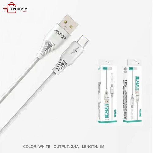 کابل مبدل آسپور تایپ سی مدل AC-07 محصولی از شرکت Aspor است. که یکی از شرکت های نوپا در زمینه ی تولید لوازم جانبی گوشی می باشد. این کابل هم برای شارژ فست و هم برای انتقال داده نیز است. این کابل دارای طول 1 متر است که دارای جنس با کیفیت سیم و بدنه است. این نوع از جنس سیم ماندگاری آن را بیشتر می کند. این کابل برای شارژ دستگاه های دارای درگاه type C طراحی شده است. کابل آسپور AC-07 با توان خروجی حداکثر 2.4 آمپری و ورودی 5 ولتی می تواند دستگاه شما را بدون هیچ مشکلی شارژ کند و در انتقال داده سرعت خوبی داشته باشد.