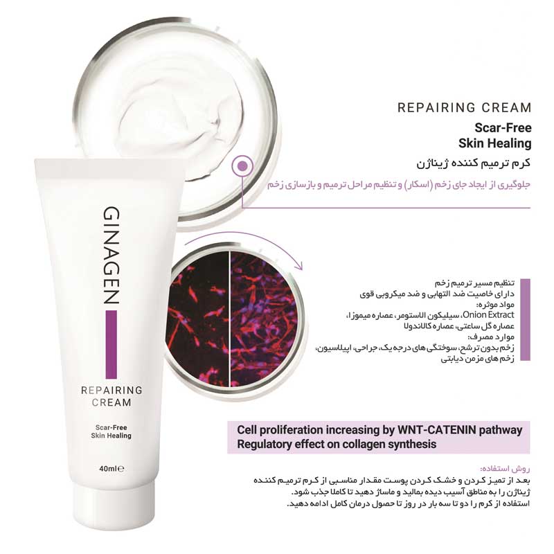 کرم ترمیم کننده ژیناژن از به جای ماندن جای زخم پیشگیری کرده و به واسطه عصاره های مختلف، موجب ترمیم و بازسازی پوست آسیب دیده میگردد. این کرم باعث تسکین و التیام التهاب، قرمزی و سوزش در محل زخم میشود. زخم تغییر در ساختار و عملکرد طبیعی پوست و بافت نرم زیرین آن است. که به دلایل مختلف از جمله آسیب حاد به پوست، خراشیدگی، سوختگی و نیش حشرات به وجود می آید. رویکرد اصلی کرم پوست اسیب دیده ژیناژن جلوگیری از ایجاد جای زخم و تنظیم مراحل ترمیم زخم است. در ترکیبات این کرم از عصاره پیاز، عصاره پوست میموزا، عصاره گل همیشه بهار، ویتامین E نیز استفاده شده است. که عصاره پیاز حاوی فلانوئیدهایی بوده و باعث کاهش التهاب میشود.