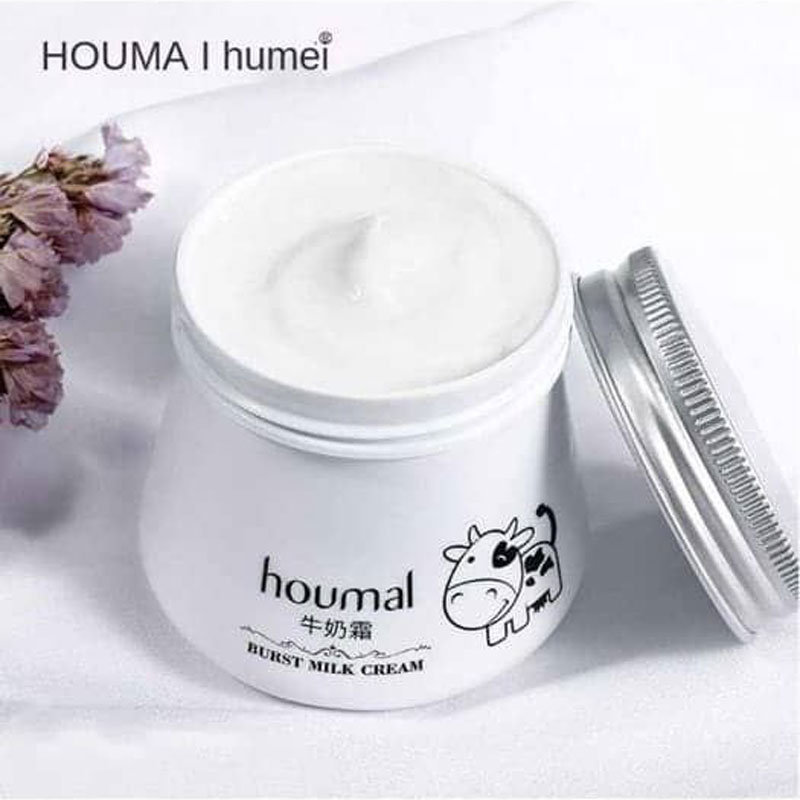 تسکین آفتاب سوختگی و التهابات پوستی : شیر موجود در کرم روشن کننده و آبرسان شیر گاو Houmal با ایجاد غشای پروتئینی نازک از پوست حفاظت کرده و احساس آفتابسوختگی را کاهش میدهد. از همهی چربی شیر برای درمان آفتاب سوختگی استفاده کنید. این چربی برای نرم کردن پوست بسیار مناسب است.