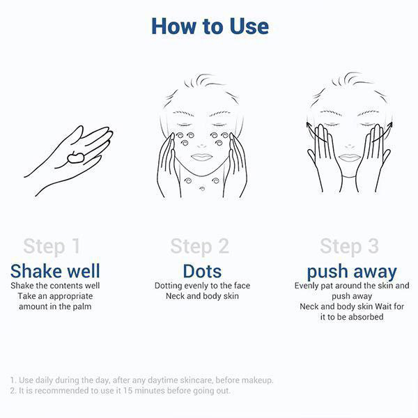 ضدآفتاب را به صورت یکنواخت روی پوست گردن و صورت نقطه گذاری کنید. در آخر به اندازه مساوی روی پوست پخش کرده و صبر کنید تا جذب شود.