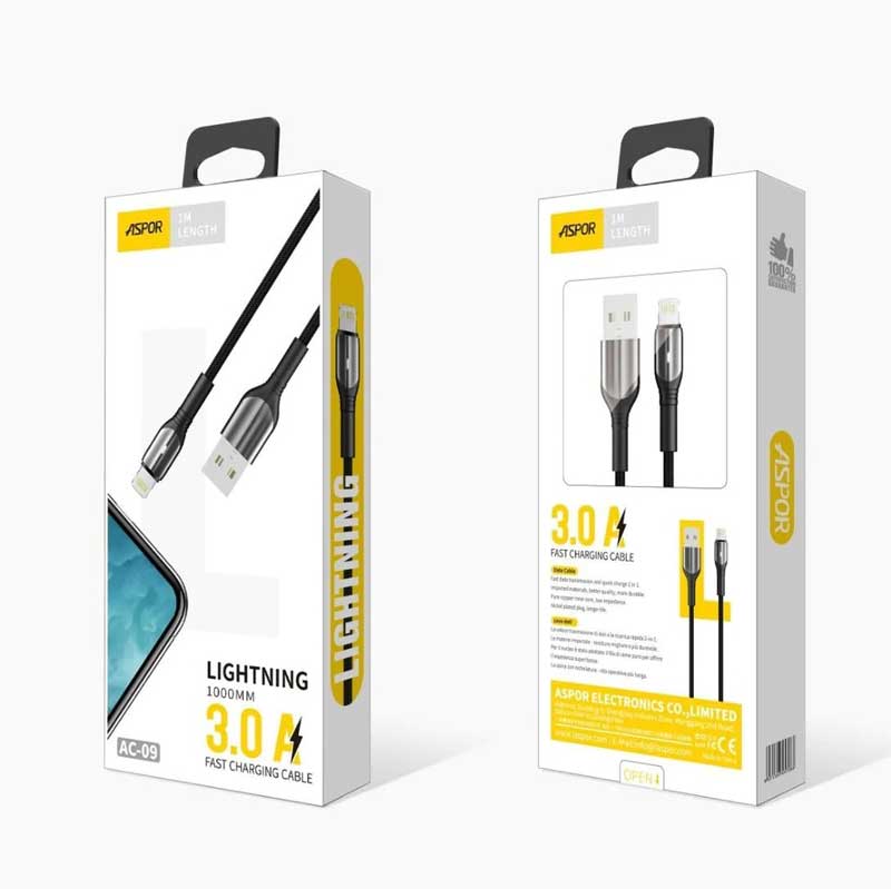 کابل شارژر آسپور آیفون مدل AC-09 محصولی از شرکت Aspor است. که یکی از شرکت های با کیفیت در زمینه ی تولید لوازم جانبی گوشی می باشد. این کابل برای انواع گوشی های موبایل و تبلت های مجهز به درگاه های لایتنینگ مناسب است. این کابل با دوام از کانکتور فلزی استانداردی بهره می برد که جای نگرانی برای شما باقی نمی گذارد. می توانید به وسیله ی این کابل دستگاه خود را شارژ کنید یا اطلاعاتتان را انتقال دهید. این کابل هم برای شارژ و هم برای انتقال داده مناسب است. در این کابل شارژ و انتقال داده به صورت همزمان انجام میگیرد. این کابل دارای استاندارد ایمنی و سلامت محصول CE نیز می باشد. این کابل از تکنولوژی Fast Charge نیز پشتیبانی می کند و طراحی شیک و ساختاری خاص دارد.