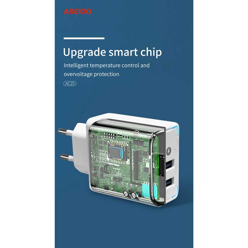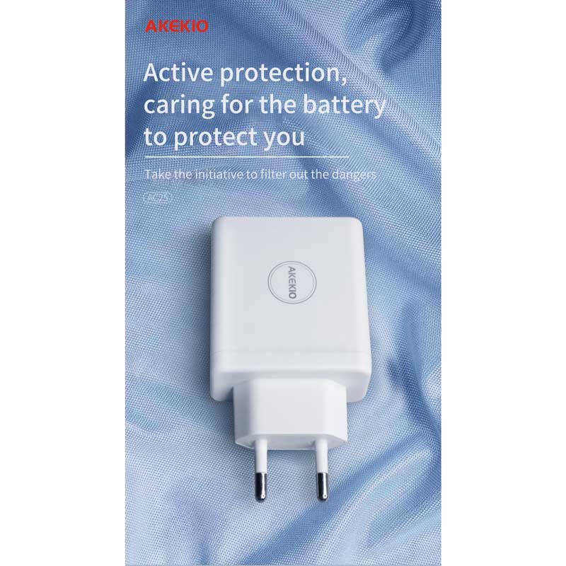 شارژر دیواری آککیو مدل AC25 دارای قابلیت کوالکام است. این قابلیت از آسیب رسیدن به باتری شما جلوگیری می کند. به این صورت که وقتی دستگاهی به این شارژر متصل می بشود، این شارژر به صورت هوشمند مقدار جریان مناسب همان دستگاه را تولید می کند. این شارژر جریان خروجی 1.5 تا 3 آمپری دارد. توان 18 واتی این شارژر به شما کمک می کند که دستگاه های خود را به صورت فست شارژ کنید. با این شارژر می توانید همزمان دو تا دستگاه را به صورت فست شارژ کنید. پوشش نسوز PVC باعث استحکام دوام بالای این شارژر می شود. این شارژر مناسب برای استفاده در سفر می باشد. به همراه این شارژر یک کابل تایپ سی قرار دارد.