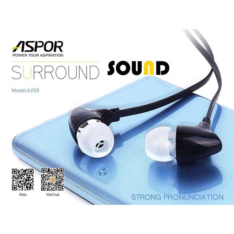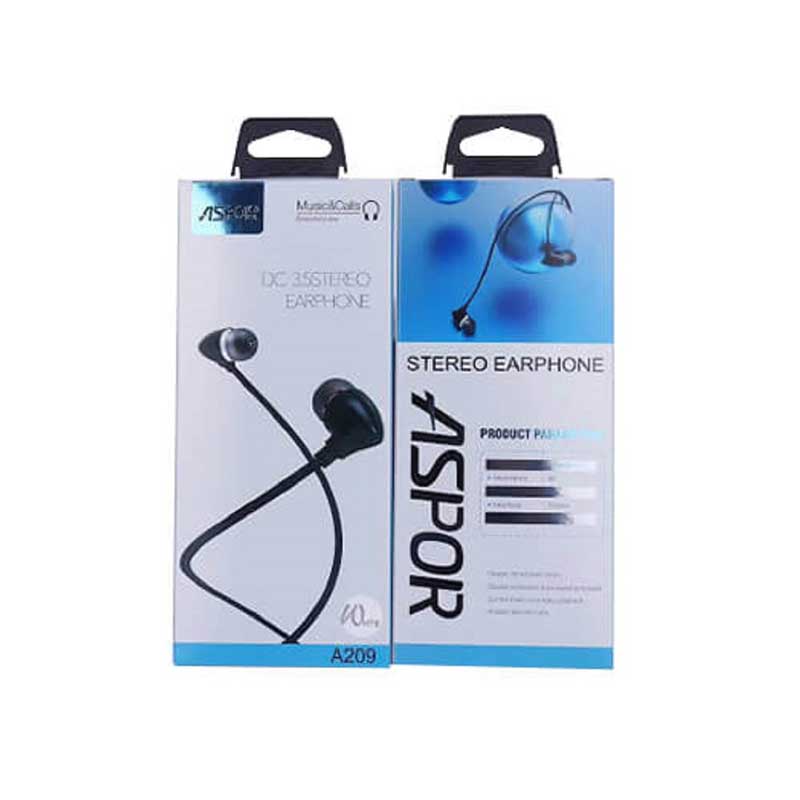 هندزفری آسپور مدل A209 با کیفیت پخش صدای HD و میکروفون HD یک هندزفری کاملا به صرفه و ارزان قیمت می باشد. این هندزفری طراحی بسیار زیبایی دارد که هنگامی که در گوش شما قرار دارد گوش های شما را اذیت نمی کند. این هندزفری دارای کنترلر بر روی سیم آن می باشد و شما به راحتی می توانید پخش موسیقی را با کنترلر کنترل کنید. شما همچنین می توانید به تماس های خود نیز با همین دکمه ی روی کنترلر پاسخ دهید و یا تماس را قطع کنید. این هندزفری برای تمامی دستگاه های دارای جک 3.5 میلی متری مناسب است. طول کابل هندزفری 120 سانتی متر می باشد. شما با این هندزفری می توانید از دیدن فیلم ها و یا آهنگ های خود لذت ببرید.
