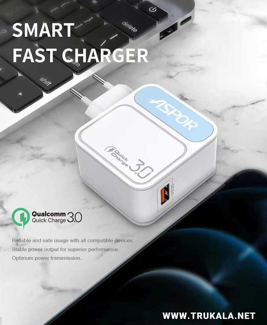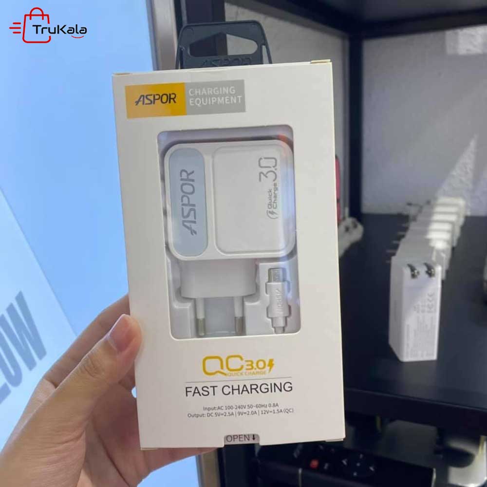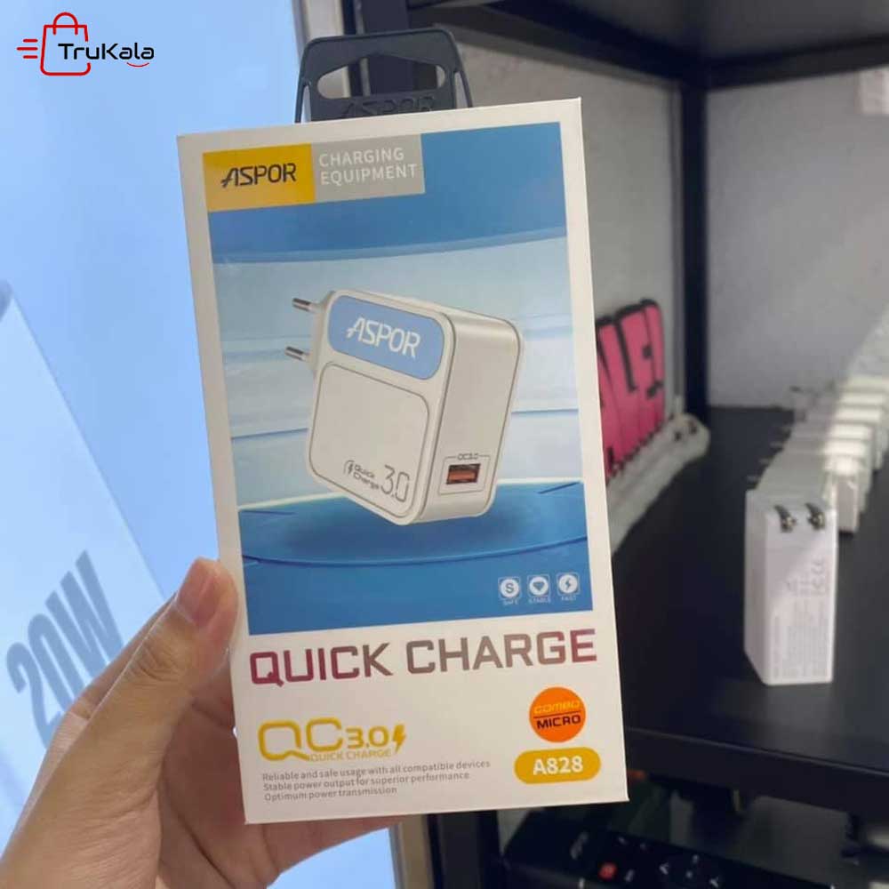 شارژر دیواری آسپور مدل A828 محصول با کیفیت شرکت آسپور می باشد که یکی از شارژر های با کیفیت بازار است. این شارژر دارای یک پورت خروجی برای شارژ گوشی های شما می باشد. این محصول دارای کله شارژر و کابل میکرو (microUSB) است. این شارژر دارای فناوری کوالکام نیز می باشد. این فناوری برای آسیب نرساندن به باتری شما قرار داده شده است. این فناوری به شارژر کمک می کند که مقدار جریان ورودی گوشی شما را تشخیص دهد و همان مقدار جریان را به گوشی شما بدهد. ورودی این شارژر برای استفاده باید بین 100 تا 240 ولت باشد. این شارژر با یک پورت حداکثر 2.5 آمپری گوشی ها و دستگاه های شما را به صورت فست شارژ کند. این آداپتور در دماهای بالا نیز قابلیت خود را از دست نمی دهد و همچنان گوشی شما را به صورت فست شارژ میکند. همچنین این شارژر دارای برد با کیفیت و قطعات هوشمند است که می تواند در حالت های مختلف کارایی خود را نشان دهد.