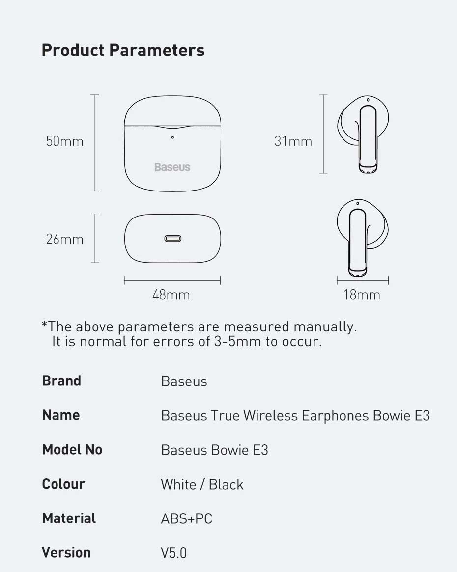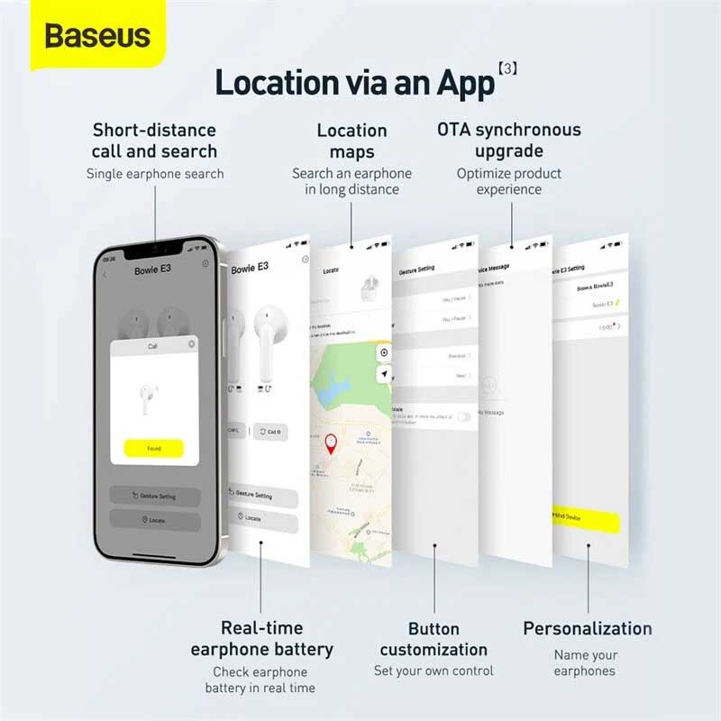 هندزفری بی سیم بیسوس Bowie مدل E3 می توانند تا 10 متر برد داشته باشند. هندزفری ها دارای بلندگو های 13 میلی متری هستند که صدای واقعی با کیفیت بالا را به شما تقدیم می کنند. این هندزفری ها هر کدام 35 میلی آمپر شارژ دارند و خود جعبه هندزفری 330 میلی آمپر شارژ دارد. همچنین واحد صوتی دیافراگم کامپوزیتی کامپوزیت 13 میلی متری با روکش تیتانیوم کامل، فرکانس سه گانه متعادل و کیفیت صدای شفاف را ارائه می دهد. همچنین شما می توانید از طریق برنامه هندزفری های خود را پیدا کنید.