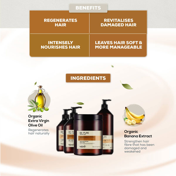 به لطف هم افزایی روغن زیتون فوق بکر و عصاره موز ارگانیک، فرمول این ماسک ترمیم کننده be pure با آسیب مبارزه می کند و در عین حال باعث ترغیب بازسازی گسترده ریشه ها می شود. در نتیجه موهای قوی تر و سالم تر هست.