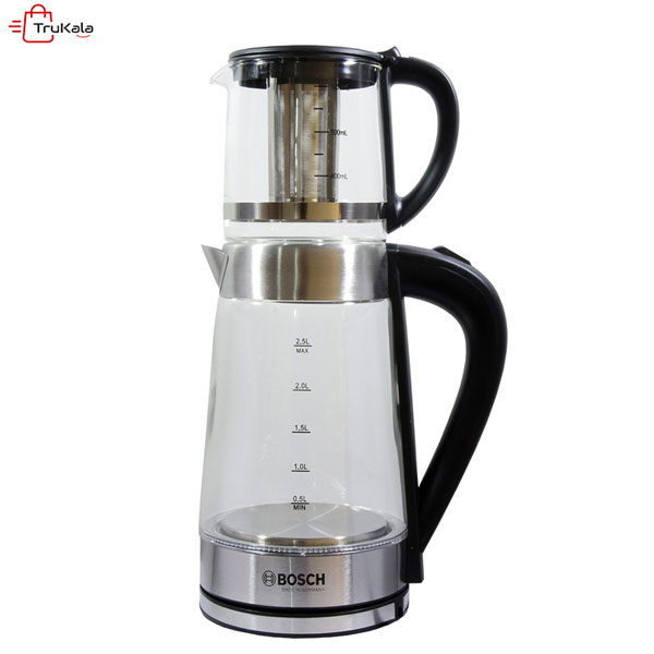 جنس بدنه کتری این چای ساز ترکیبی از استیل و شیشه پیرکس و همچنین دارای نشانگر سطح آب کتری است. ظرفیت قوری و کتری این چای ساز به ترتیب برابر 2.5 و 1.1 لیتر است. بنابراین با یک بار استفاده از این چای ساز، مقدار زیادی چای و آب جوش تهیه می شود. چای ساز بوش قابلیت چرخش ۳۶۰ درجه کتری روی پایه را دارد و می توانید آن را در هر جهتی که می خواهید بچرخانید و روی پایه قرار دهید.