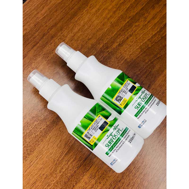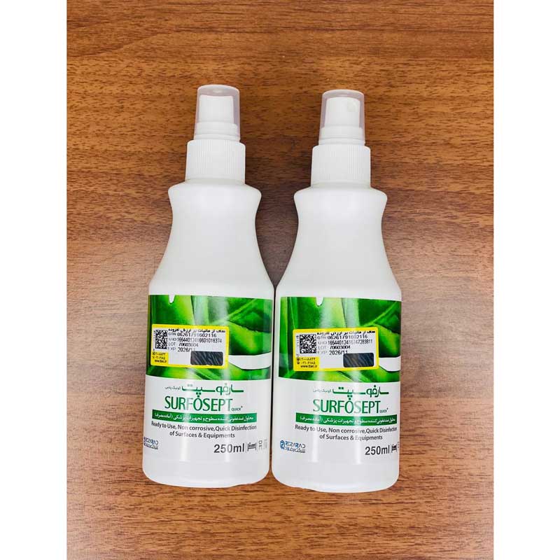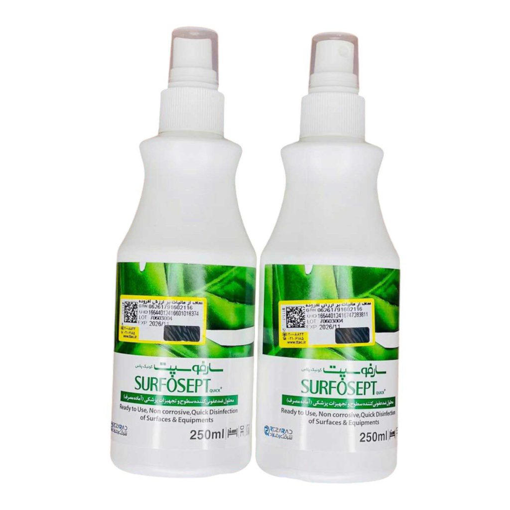- ضد عفونی سریع و مؤثر: محلول ضد عفونی کننده سارفوسپت کوییک پلاس بهسرعت و بهطور قوی میتواند سطوحی که در تماس با بیماران هستند، شامل تخت های بیمارستانی و یونیت های دندانپزشکی را ضدعفونی کند.