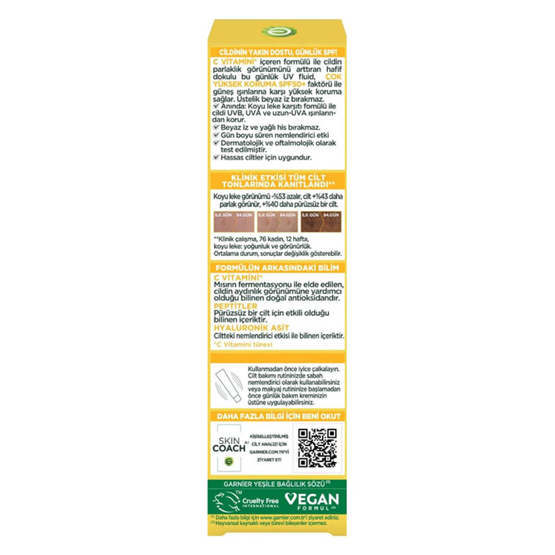 ضد آفتاب بی رنگ ویتامین سی گارنیر با SPF50 طراحی شده تا از پوست در برابر اشعههای مضر خورشید، به ویژه اشعههای UVA و UVB، محافظت کند. ضد آفتاب بی رنگ ویتامین سی گارنیر قادر است تا 98 درصد از پوست را در برابر اشعههای UVB محافظت نماید.
