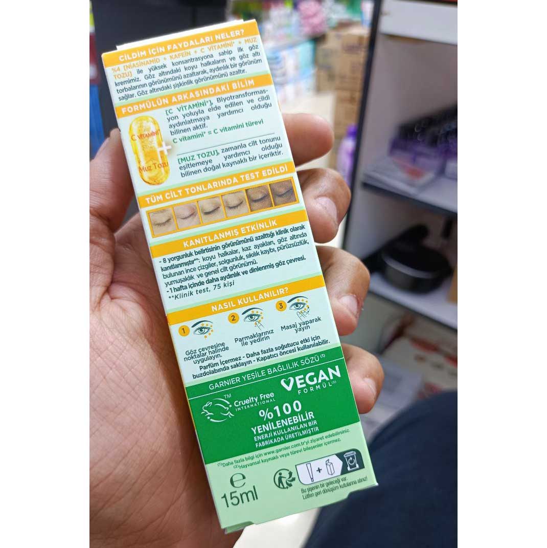 کرم دور چشم گارنیر حاوی ویتامین C است. این ویتامین یک اکتیو قوی برای روشن کردن پوست و کاهش لک است. کافئین دور چشم گانیر علاوه بر کاهش تیرگی دور چشم، باعث کاهش پف، خستگی و حلقههای تیره دور چشم میشود. همچنین کرم دور چشم ویتامین سی گارنیر حاوی پودر موز و نیاسینامید است. در واقع پودر موز و نیاسینامید باعث روشن و یکدست شدن پوست میشود.