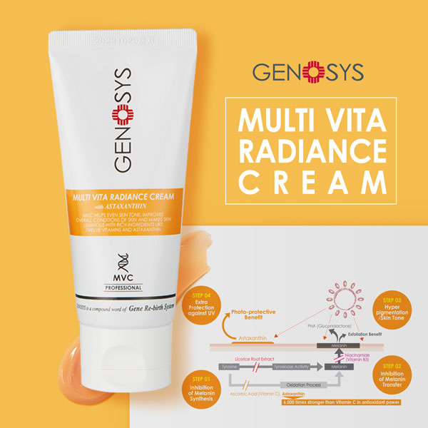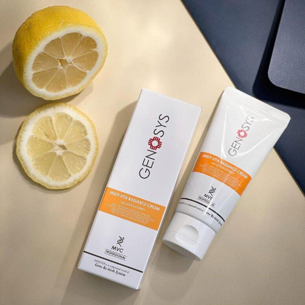کرم ضدلک و مولتی ویتامین رادیانس ژنوسیس با محتوای غنی از دوازده ویتامین و آستاگزانتین به جلوگیری از ایجاد لک کمک می کند و در عین حال از پوست در برابر اشعه های مضر خورشید محافظت می کند. از یکسان سازی رنگ پوست و روشن شدن پوست پشتیبانی می کند. نارنجی بودن کرم به دلیل رنگ طبیعی آستاگزانتین است.