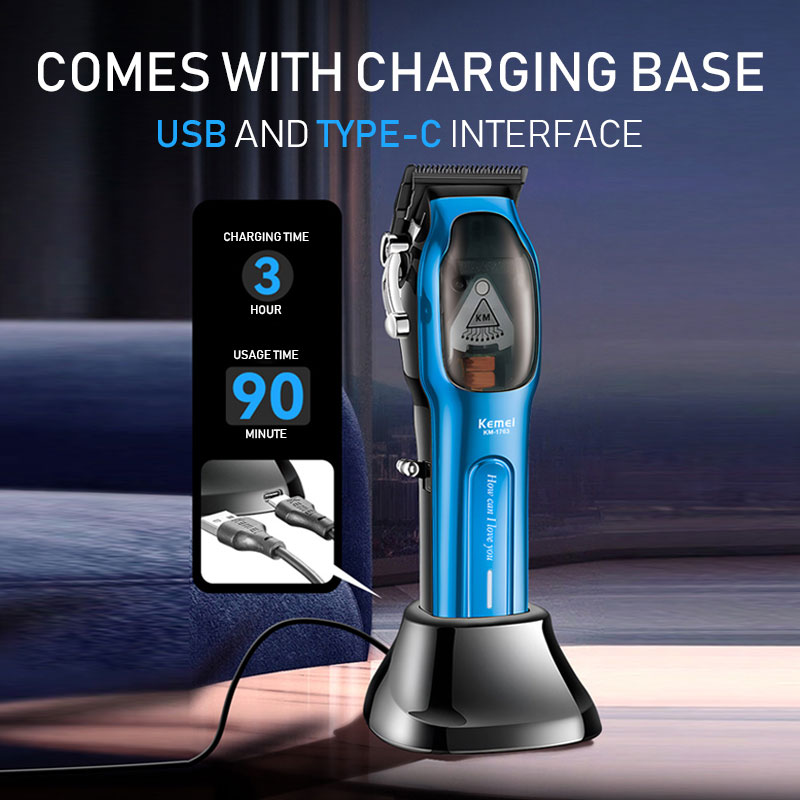 ماشین اصلاحی کیمی 1763 یک نمونه کاملاً حرفه برای استفاده در سالن های پیرایش است.ماشین اصلاح موی سر کیمی مدل KM-1763 در بالا دارای یک دریچه شفاف است که می توان موتور دستگاه را در زیر آن به رنگ مسی مشاهده کرد و پوششی به رنگ آبی درخشان که دور تا دور آن را فراگرفته و در قسمت پایین از پلاستیک مرغوب و به رنگ مشکی ساخته شده است.