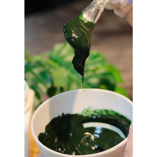 مقداری از پودر، حدود 2 قاشق اندازه گیری شده را با آب ولرم تقریباً 37 درجه مخلوط کنید. سپس روی پوست بمالید، بهتر است صورت را با فویل آلومینیومی بپوشانید تا از خشک شدن جلبک ها جلوگیری شود. جلبک ها در دماهای بالاتر و گرمتر فعال می شوند. بگذارید 15 تا 20 دقیقه ماسک خوردشده بماند سپس با آب ولرم صورت را ماساژ دهید و با اسفنج یا حوله پاک کنید.
