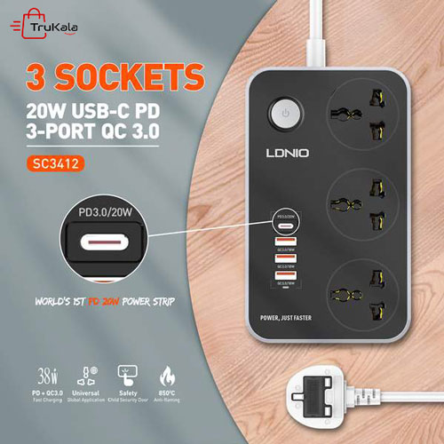 چند راهی برق الدینیو مدل SC-3412 محصول شرکت الدینیو (LDNIO) می باشد که یکی از شرکت ها پیشتاز در عرصه تولید لوازم جانبی می باشد. این برند اکنون یک چند راهی یا همان هاب را عرضه کرده است. ورودی برق این مدل هاب از هر مدل دو شاخه و سه شاخه ای را میتوانید به آن وصل کنید و اینکه تا 10 آمپر برق را ساپورت میکند. همچنین این چند راهی دارای سه پورت خروجی USB است که هر کدام به تنهایی تا 18 وات و در مجموع هم همان 18 وات توان را میتوانند انتقال دهند. پورت های USB این رابط برق از کوالکوم 3.0 پشتیبانی میکند. نکته ویژه این رابط برق این است که یک خروجی تایپ سی 20 واتی هم دارد و تکنولوژی PD یه همان پاور دلیوری پشتیبانی میکند. همچنین با خرید این چند راهی می توانید به خرید چندین شارژر و کله شارژر جداگانه و سه راهی جداگانه نیازی نداشته باشید.