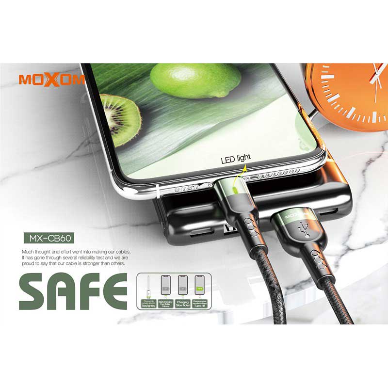 کابل شارژر موکسوم آیفون مدل MX-CB60 ساخته شده و طراحی شده توسط شرکت موکسوم (Moxom) می باشد. این شرکت در تولید لوازم جانبی گوشی پیشتاز می باشد. با این کابل شما می توانید دستگاه های خود را با شارژ سریع حداکثر 2.4 آمپری شارژ می کند. این کابل از قابلیت شارژ سریع کوالکام 3.0 نیز پشتیبانی می کند. این کابل ساخته شده از مواد حفاظت از محیط زیست است و به محیط زیست آسیب نمی رساند. این کابل 1 متر طول دارد.