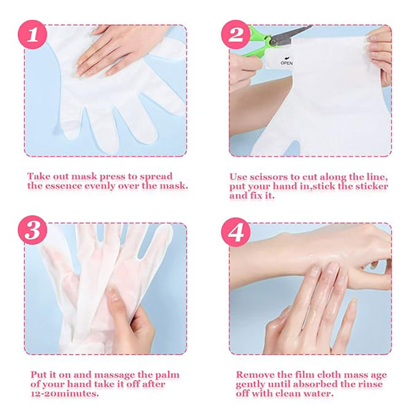 دست های خود را شسته و سپس خشک نمایید و داخل این ماسک های دستکشی قرار دهید. به مدت 20-40 دقیقه در این حالت بماند تا ژل ماسک کاملاً جذب دست شود. سپس ماسک ها را از دست بیرون آورده و دست ها را به آرامی با آب و صابون شست و شو دهید و در آخر از کرم یا لوسیون مخصوص دست استفاده کنید.