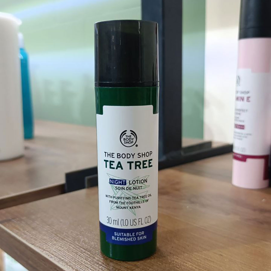 لوسیون شب درخت چای (تی تری) بادی شاپ (The Body Shop Tea Tree Night Lotion) یک لوسیون آبرسان شب مخصوص پوست های جوش دار و مستعد آکنه است. این لوسیون حاوی عصاره طبیعی از درخت های چای کنیا بوده و دارای بافت فوق سبک و ژلی می باشد. لوسیون تی تری بادی شاپ پوست های چرب و جوش دار را آبرسانی کرده و در عین حال چربی و سبوم پوست را تنظیم و کنترل می کند.