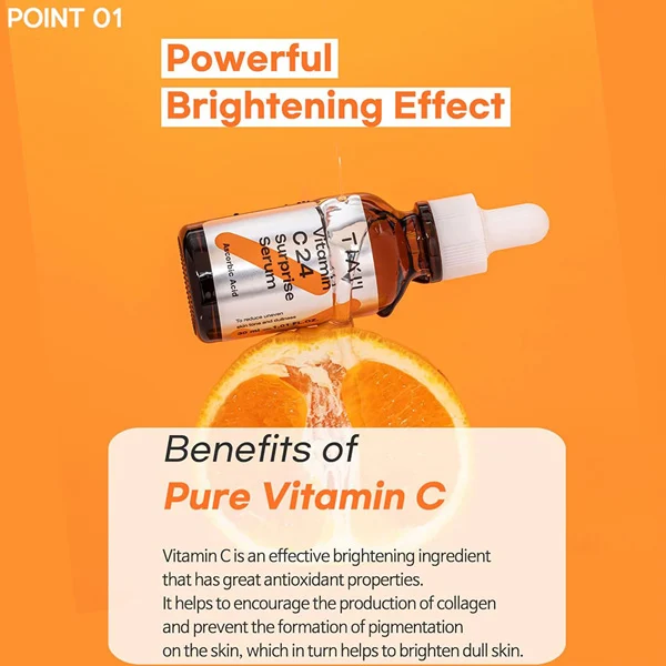 غلظت بالای ویتامین C در سرم روشن کننده ویتامین سی 24 درصد سورپرایز تیام به محو لکههای تیره، لکههای ناشی از افزایش سن و تغییر رنگ پوست کمک میکند. استفاده منظم از سرم ویتامین سی ۲۴٪ سورپرایز تیام باعث میشود پوست ظاهری صافتر، شفافتر و شادابتر داشته باشد.