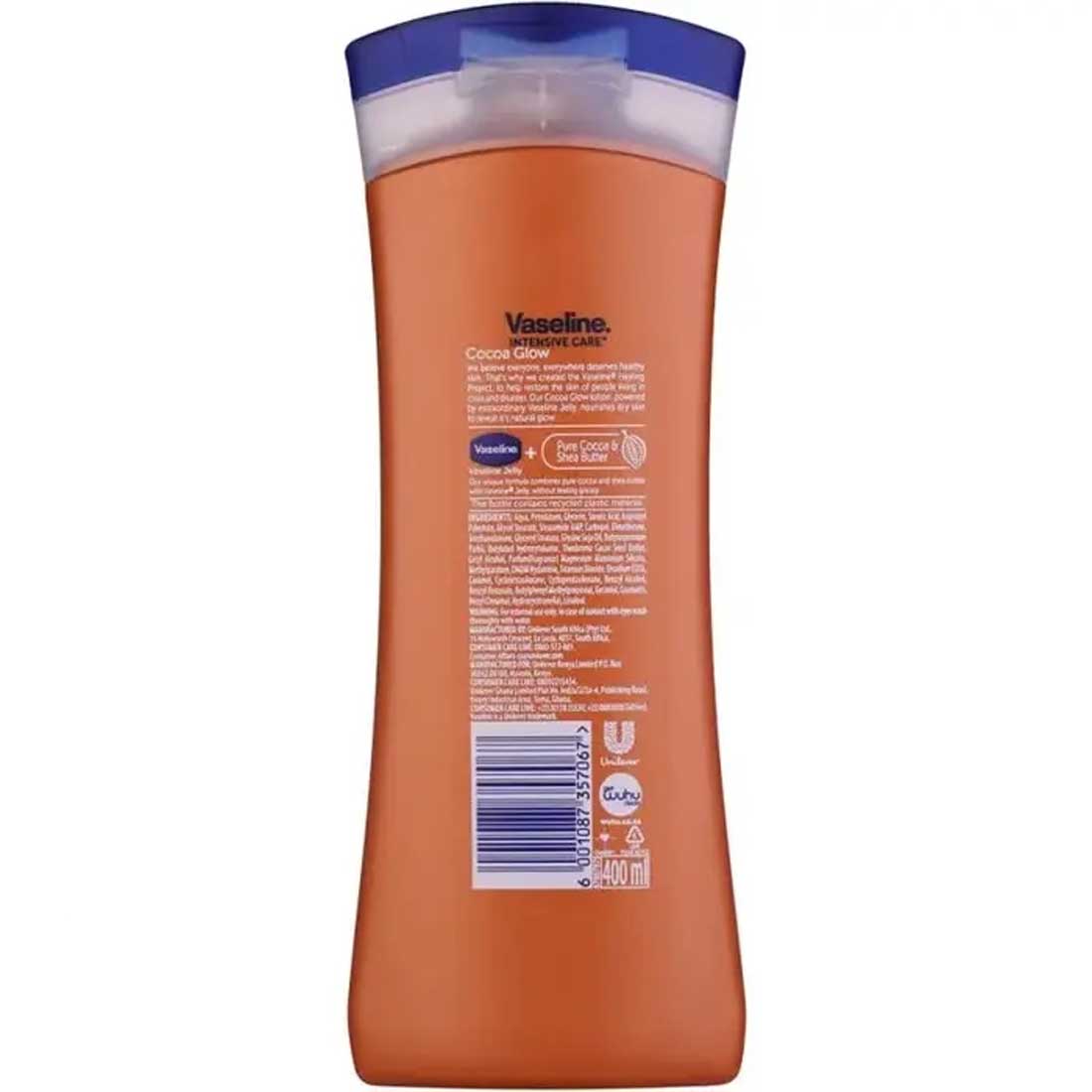 لوسیون بدن کاکائویی وازلین مدل cocoa glow مناسب پوست خشک حجم 400 میلی لیتر