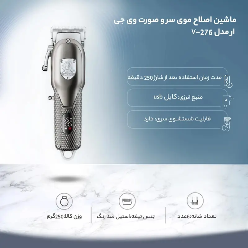 ماشین اصلاح وی جی آر 276 یکی از بهترین گزینه ها در بازار لوازم آرایشی و بهداشتی است که با طراحی مدرن و عملکرد بینظیر خود، توجه بسیاری از حرفه ایها و کاربران خانگی را به خود جلب کرده است. این ماشین اصلاح نه تنها برای اصلاح مو های سر، بلکه برای مرتب کردن ریش و سبیل نیز مناسب است و به کاربران این امکان را میدهد که به راحتی به ظاهری آراسته و مرتب دست یابند.اگر به دنبال یک ماشین اصلاح با کیفیت، کارآمد و با قابلیتهای منحصر به فرد هستید، ماشین اصلاح حجم زن وی جی آر 276 گزینه ای ایده آل برای شما خواهد بود. ماشین اصلاح وی جی آر 276 با ترکیبی از تکنولوژی پیشرفته و طراحی کاربرپسند، تجربه ای لذتبخش و آسان از اصلاح مو را برای شما به ارمغان میآورد. با انتخاب ماشین اصلاح وی جی آر 276، به ظاهری آراسته و حرفهای دست خواهید یافت.